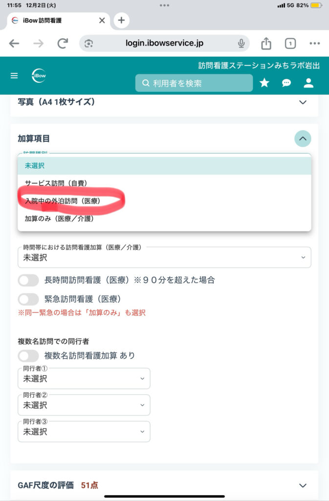 ※加算項目→入院中の外泊訪問(医療)を選択する。事務へその旨を伝えること。